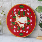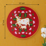 This exquisite pichwai features a mother cow and her calf, meticulously hand-painted on a red plate. The intricate details and vibrant colors make this painting a unique and eye-catching piece of art, perfect for any home.